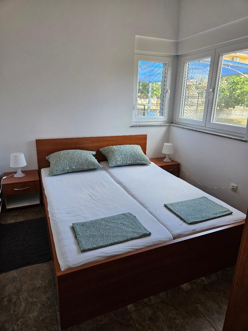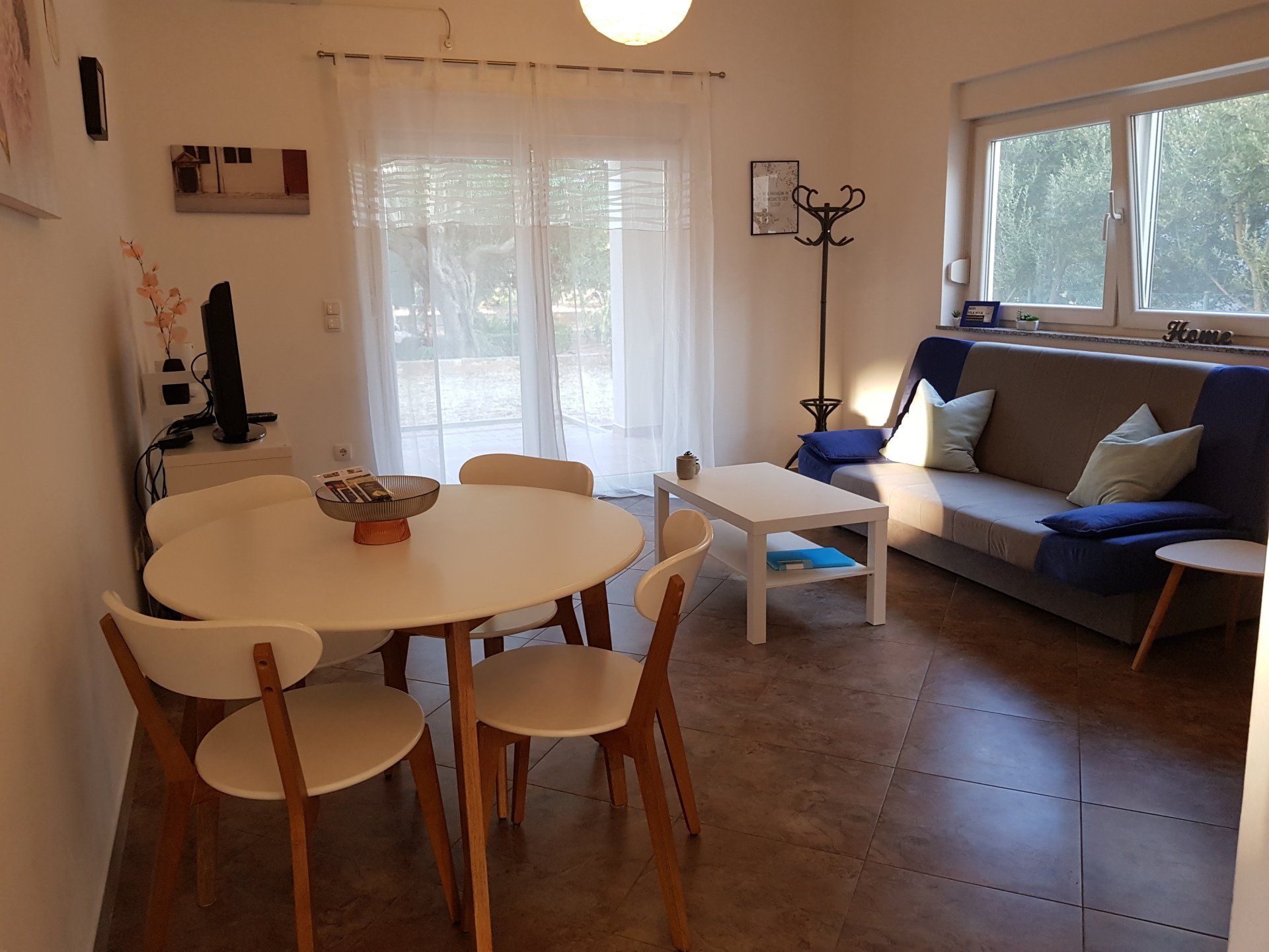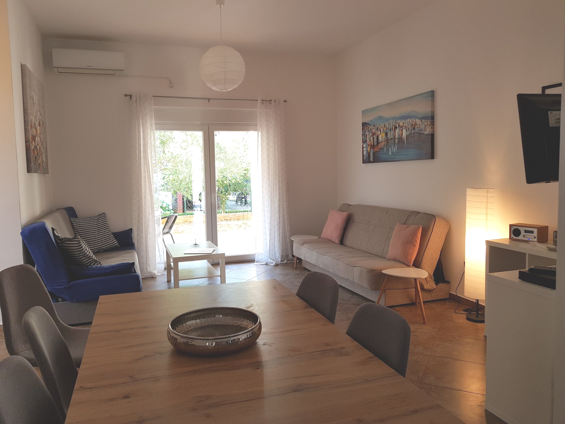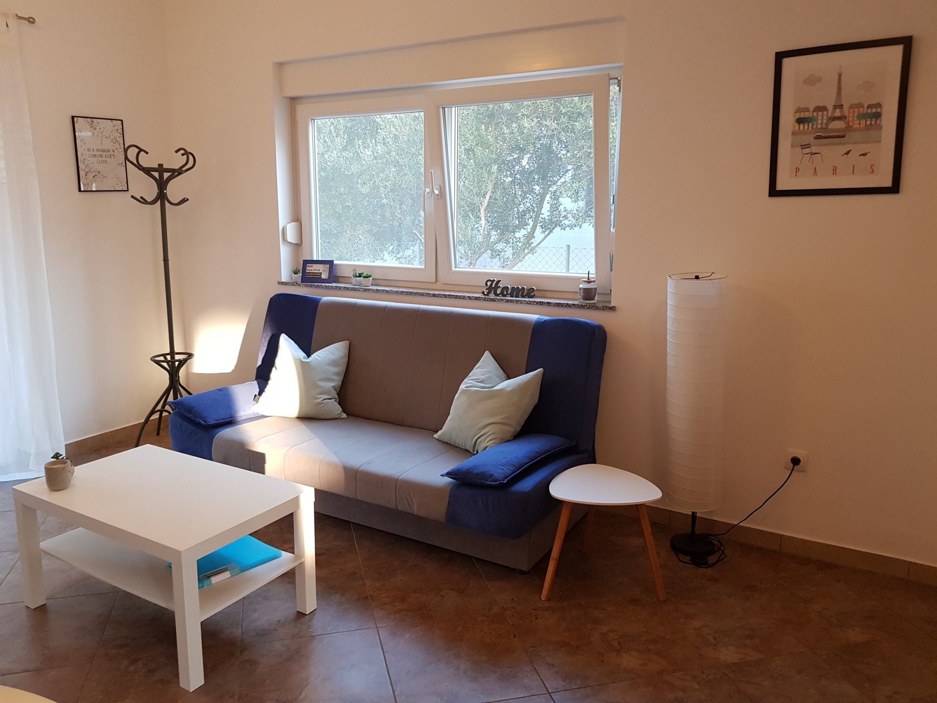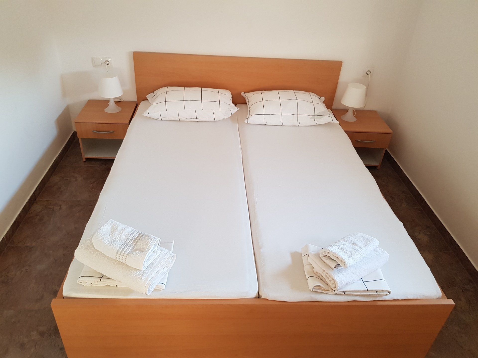 1. Obergeschoss und ist für max. 4+1 Personen ausgelegt. In den Schlafzimmern befinden sich jeweils ein Doppelbett und im Wohnzimmer ist ein Schlafsofa vorhanden. Das Bad bietet eine Dusche und zur Verfügung gestellte Handtücher. Die Handtücher können auf Wunsch wöchentlich gewechselt werden. Das klimatisierte Apartment hat einen Wohnbereich mit einer Sitzecke und einem Flachbild-Satelliten-TV (inkl. deutscher und kroatischer Fernsehsender), DAB-Radio sowie einer komplett ausgestatteten Küche mit Essbereich. Der Balkon lädt zum Verweilen auf den Gartenmöbeln ein und bietet zudem einen Ausblick auf das wundervolle kroatische Meer. Der im Garten befindliche, gemauerte Außengrill darf gerne für Grillabende genutzt werden.